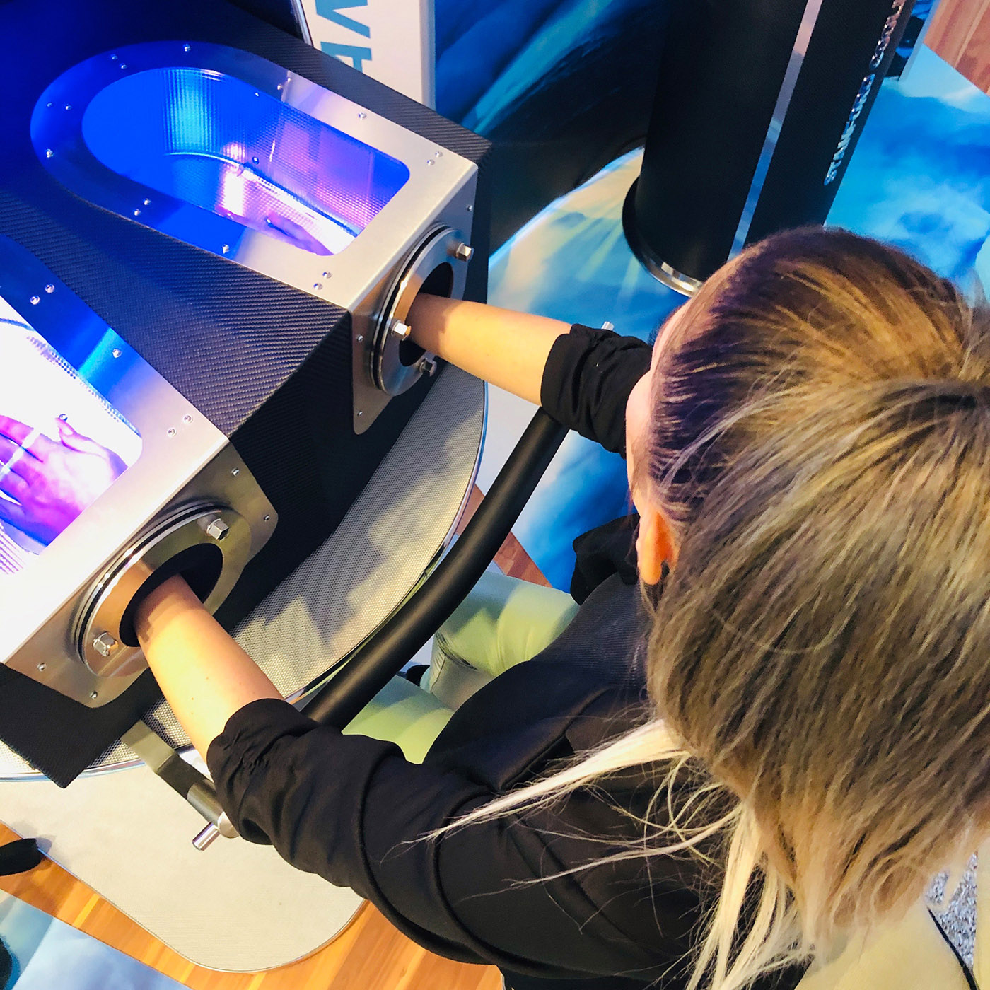 Als Anwender müssen Sie nichts weiter tun, als dieHandflächen auf zwei Kühlflächen zu legen und die Behandlung zu genießen. Mit dieser revolutionären Methode setzt die Wirkung sofort ein – von Kopf bis Fuß, obwohl nur die Handflächen heruntergekühlt werden: schonend zur Haut bei etwa 4° Grad Plus.